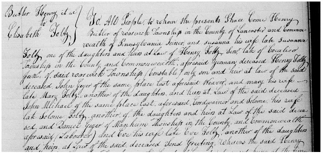 “To all people, to whom the presents shall come Henry Beidler of Warwick Township in the County of Lancaster and Commonwealth of Pennsylvania, Joiner and Susanna his wife, late Susanna Foltz, one of the daughters and heirs at law of Henry Foltz, Sr., late of Cocalico Township in the County and Commonwealth aforesaid Yeoman deceased. Henry Foltz, Jr. Of said Warwick Township (Constable) only son and heir at law of the said deceased. John Geyer of the same place last aforesaid Weaver, and Mary his wife ~ late Mary Foltz another of the daughters and heirs at law of the said deceased. John Michael of the same place last aforesaid, Cordwainer and Salome, his wife, late Salome Foltz, another of the daughters and heirs at law of the said deceased and Daniel Geyer of Manheim Township in the same County and Commonwealth (Labourer) and Eve his wife, late Eve Foltz, another of the daughters and heirs at law of the said deceased. Send greetings, Whereas the said Henry Foltz…”