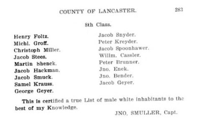 One last group of records show that Henry Foltz, Jacob Geyer and George Geyer (I have seen family trees that indicate that Jacob and George Geyer are brothers) listed as being part of the Lancaster PA Militia: