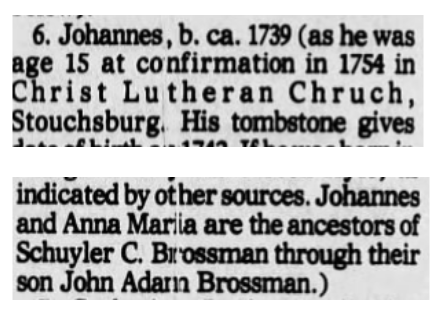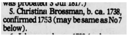 It has been difficult at best to find any records that specify a middle name or substitute name for Justina. The record above is the only one that mentions a Christina and matches the timeline for Justina. She was born in 1737 just before the Brossmans immigrated.