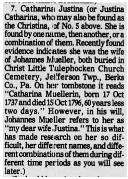 As you can see, Schuyler and I are of the same mindset. The one thing that Schuyler may have never found out was the fact that Justina Mueller moved away from Berks Co., PA sometime after 1798 to Cumberland Co., PA where her daughter Justina Fenical either lived or was moving to. Justina Mueller died there in 1816.