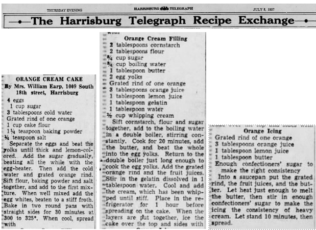 So I started my searches with Mrs. William Earp…I got a number of hits, but the one the lured me in was from the Harrisburg Telegraph, of Thursday, 08 July 1937. I was stunned to see a recipe submitted by my great-grandmother. The Harrisburg Telegraph had a page dedicated to recipes from all around the Harrisburg area called “The Harrisburg Telegraph Recipe Exchange”.