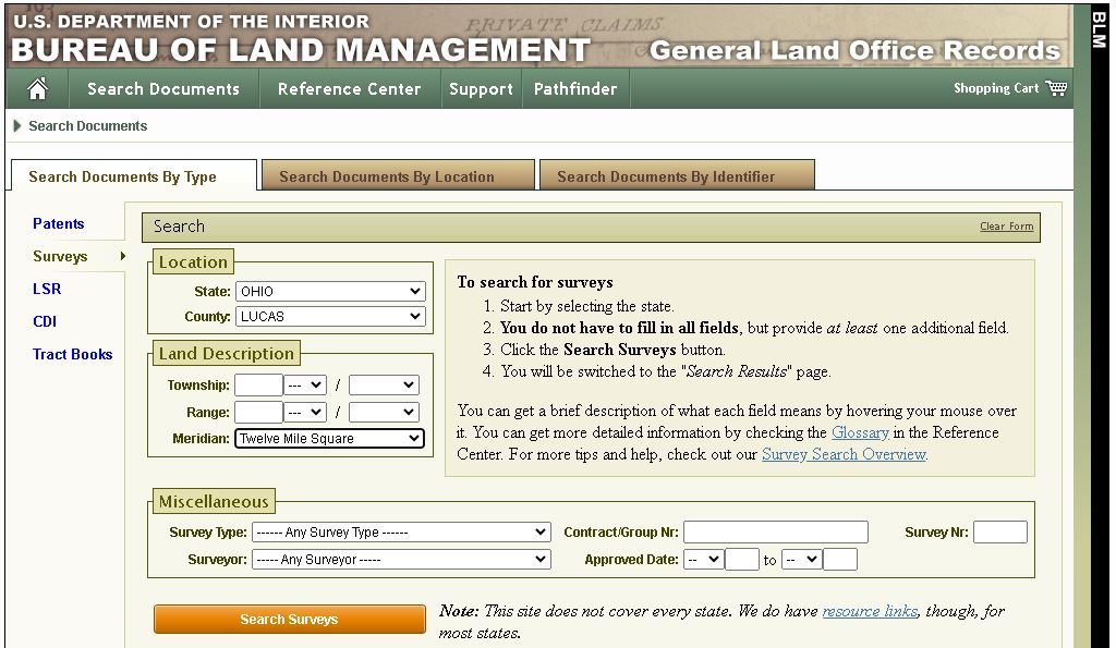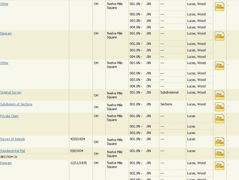 I decided to go back to the BLM (Bureau of Land Management) website and take another crack at finding more documents about the 12 mile square reserve. This time I really looked through every single item I could and decided not to use any date ranges as search criteria. I simply used State: Ohio, County: Lucas and Meridian: Twelve Mile Square:
