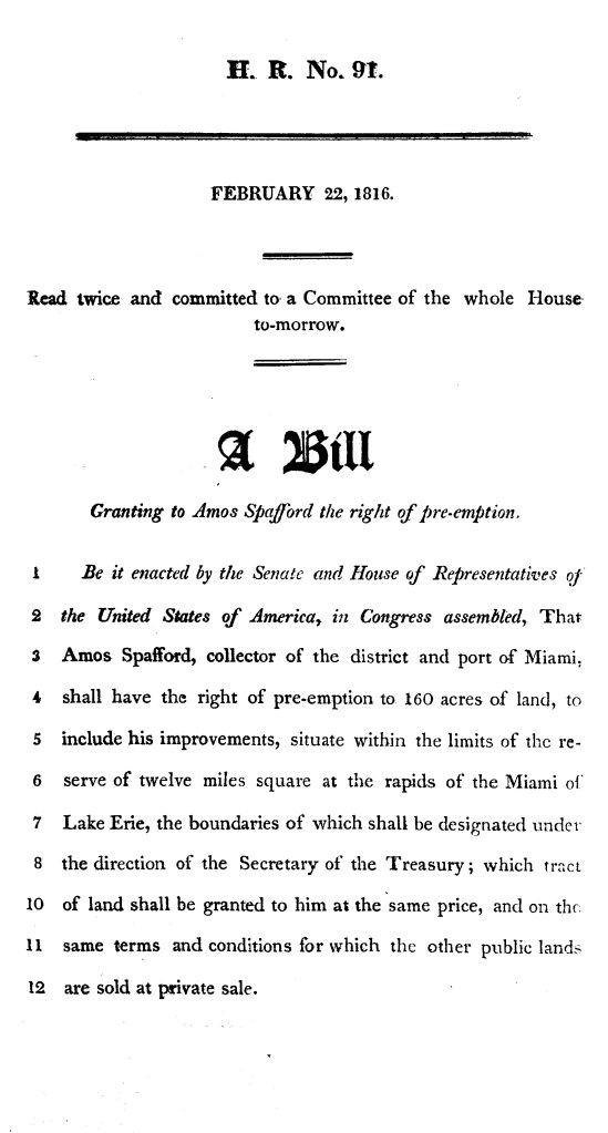 Maj. Amos Spafford (1753-1818) – Surveyor, collector, & postmaster was born in CT, served at the Battle of Fort Meigs under William Henry Harrison. Amos named the cities of Cleveland and Perrysburg. He also traveled to Washington, D.C. twice to petition the U. S. government on behalf of himself and other men on this map to have their lands returned to them by right of pre-emption* after the War of 1812. Amos Spafford and family members are buried at the Ft. Meigs cemetery (Spafford’s tract is between tracts No. 64 & No. 65 as mentioned on his Historical Marker).